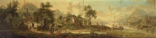 | AN EXTENSIVE RIVER LANDSCAPE WITH TRAVELLERS ON A PATH IN A VILLAGE AND FIGURES IN A SAILING BOAT TO THE RIGHT | |