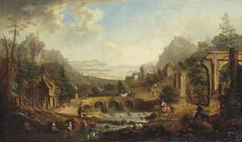 | An extenssive mountaineous river landscape with horsemen, shepherds and other figures amidst classical ruins near a village | |