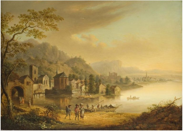 FLUSSLANDSCHAFT MIT UFERBEBAUUNG UND RUINE