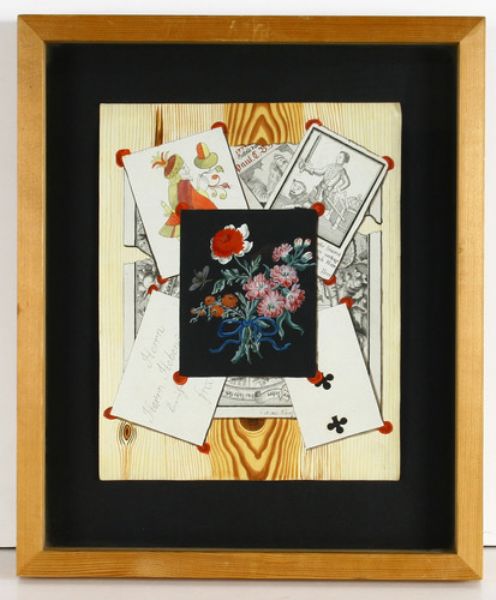 | Quodlibet mit Feldblumenstrauß vor Spielkarten und Kupferstichen arrangiert vor illusionistischer Bretterwand. | |