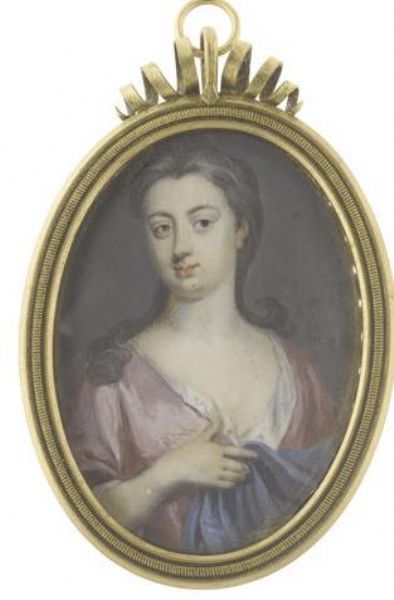 | A Lady, wearing pink robe over her open white chemise, holding a blue mantle in her right hand, her hair partially upswept and f | |