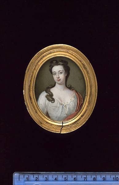 | A Lady, wearing white dress and pink cloak over her left shoulder, her brown hair falling over her right shoulder | |
