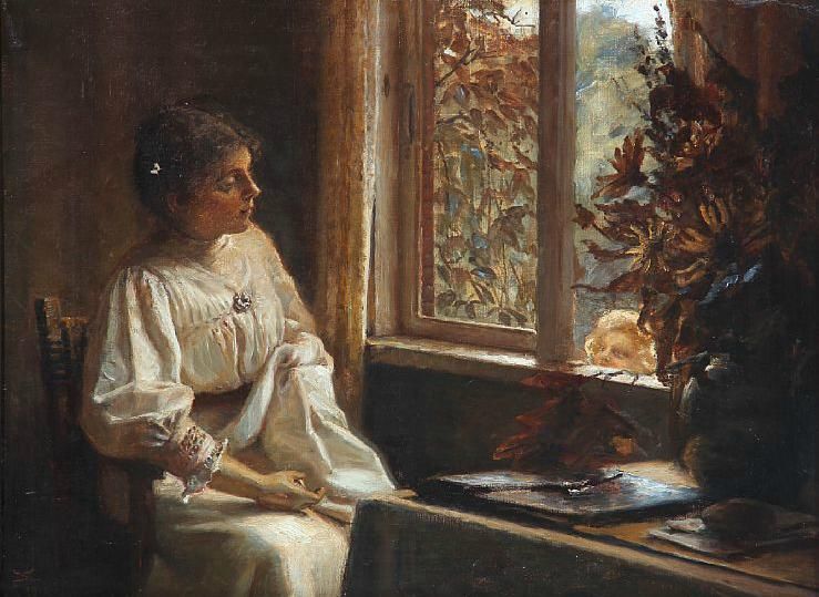 | Interior with a sewing woman and a child looking through the open window | |