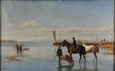 | An extensive shore scene - a soldier boy groom watering horses, women washing clothes, sailing barge at a jetty | |