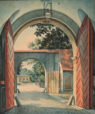 “Sjællandsporten set inde fra Kastellet”. The gate of The Copenhagen Citadel. Signed with monogram. Watercolour on paper laid on paper. Sheet size 30×25.5 cm. | |