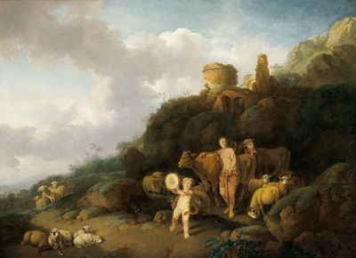| Pastoral scene with a shepherdess and a putto with a tambourin in a mountainous landscape | |