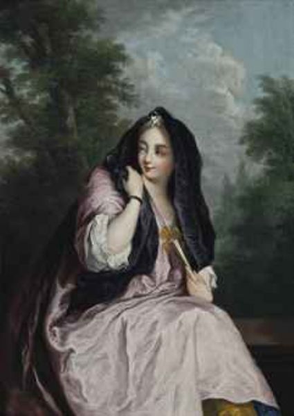 | Portrait of a lady, three-quarter-length, in a pink dress, and a black shawl, a fan in her left hand, seated in a landscape | |