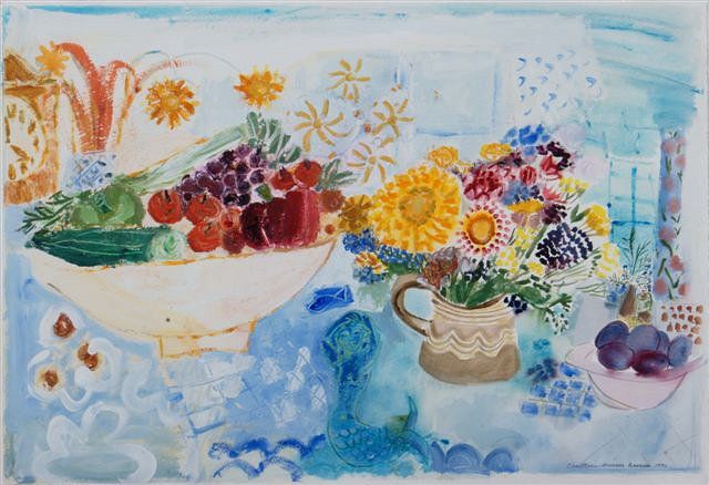 Still life - A jug of mixed flowers, bowls of fruit and clock within an interior