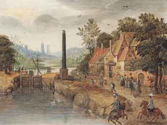 | A river landscape by a lock, with elegant company on horseback and villagers on the bank | |