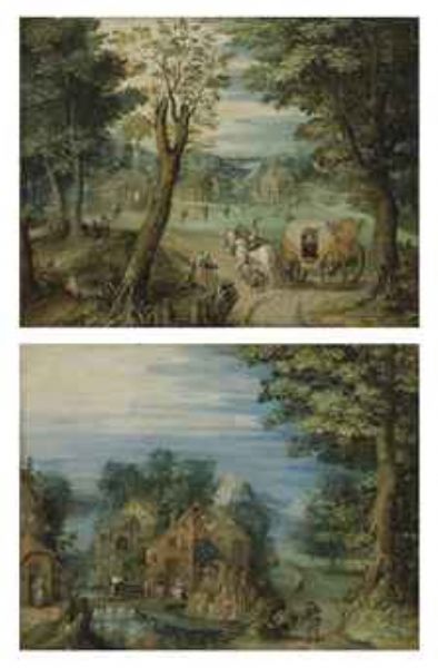 | Travelers at a crossroads with a village beyond; and A river landscape with a village and figures | |