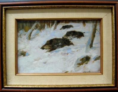 WILD BOARS RUNNING THROUGH WINTER WOODLAND