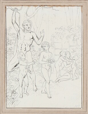 Two sheets with Adam and Eve and their children. 1807–1809. Unsigned. Drawing ink and pencil on paper. Sheet sizes 162×120 mm and 168×120 mm. (2).