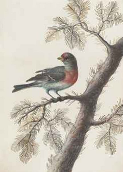 | A bird, probably a bullfinch, on a pine branch | |