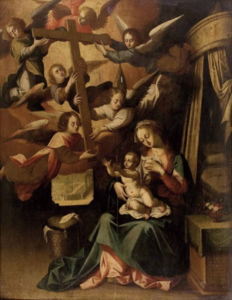 Engel bringen der Madonna lactans mit Jesuskind das Kreuz