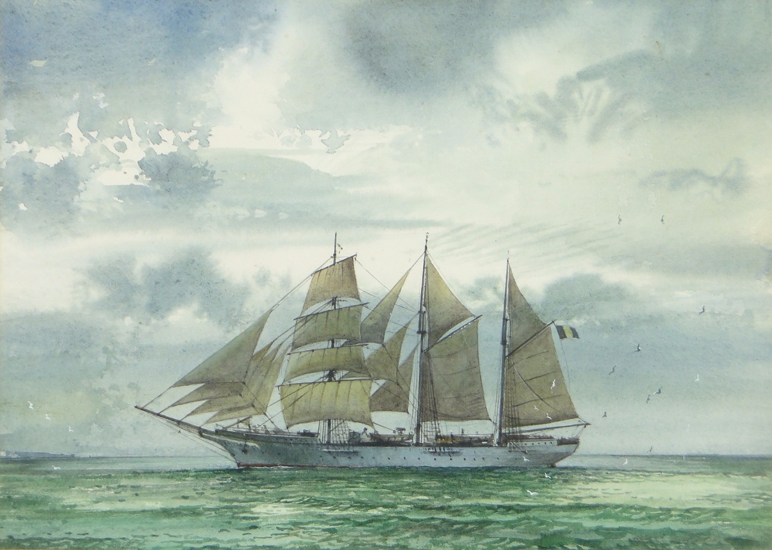 A full rigged barquentine on a calm sea