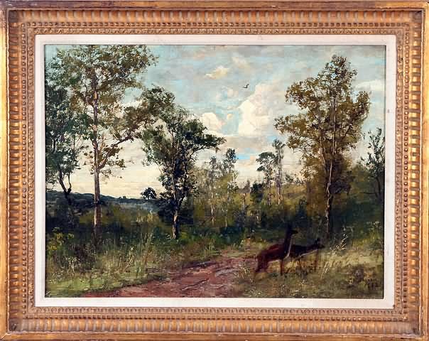 Woodland landscape with deer