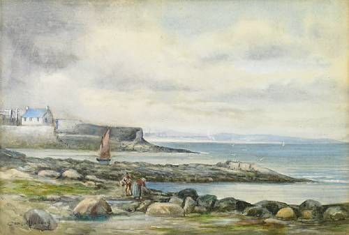 | A rocky coastal scene with figures collecting mussels in the foreground | |