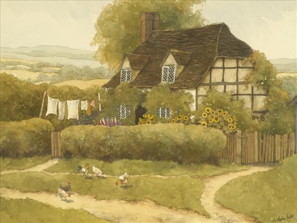 | Wash Day, a timbered cottage with sunflowers and poultry | |