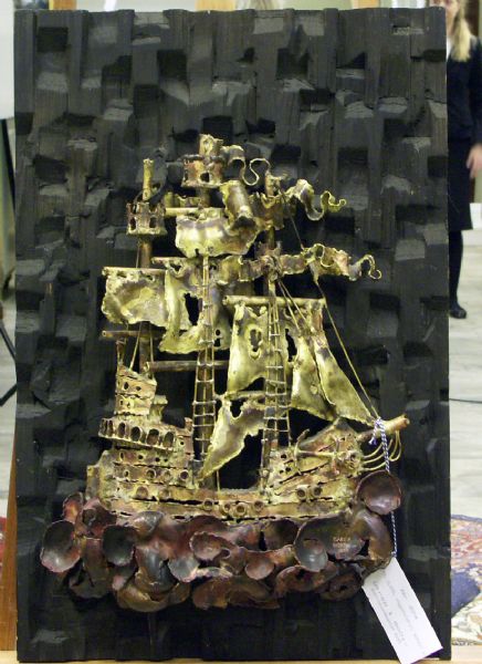 Segelfartyg i målad metall mot mörk bakgrund i trä
