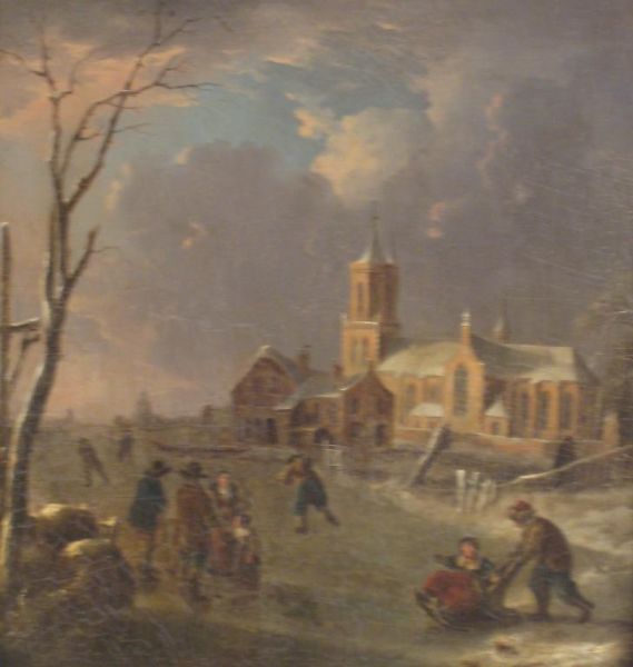 A frozen river Landscape with Figures skating, town buildings beyond