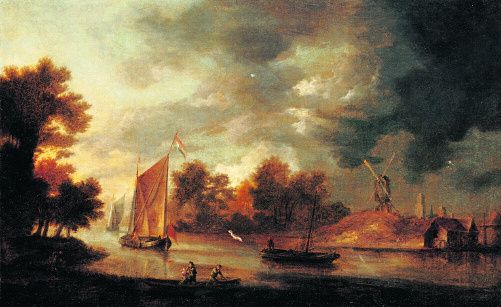 Fluss–landschaft mit Segelbooten und Windmühle