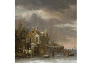 WINTERLANDSCHAFT MIT ALTEM HAUS AN GEFRORENEM UFER