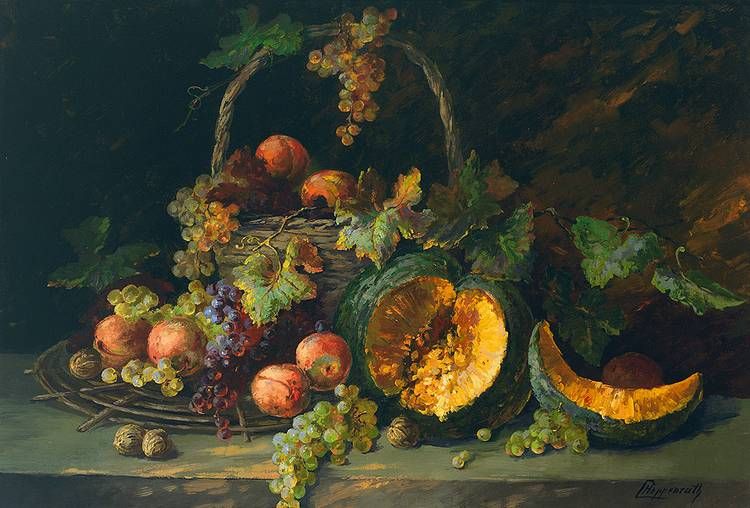 Melone, Pfirsiche, Trauben und Weidenkorb, malerisch arrangiert.