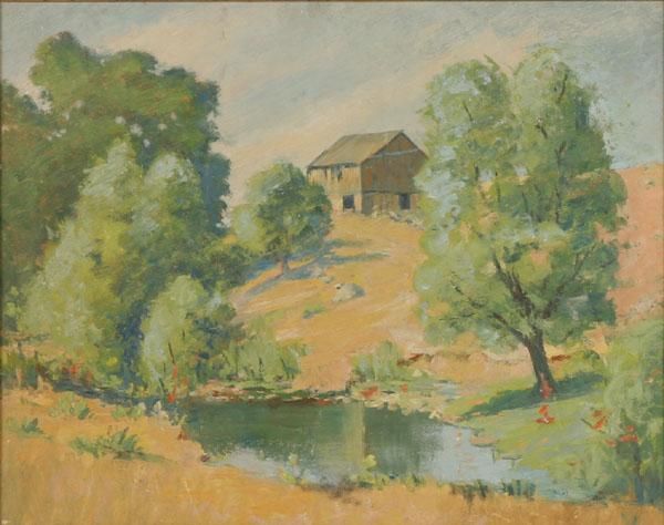 | summer scene depicting a barn set upon a hill with a lake in the foreground | |