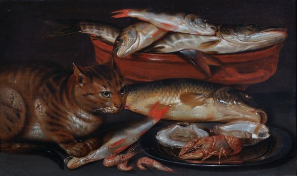 A cat sitting by a bowl of fish and a silver plate with two oysters, a lobster and shrimps