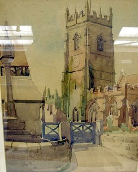 | View of a gateway leading to a sandstone church with war memorial and lychgate to the fore | |