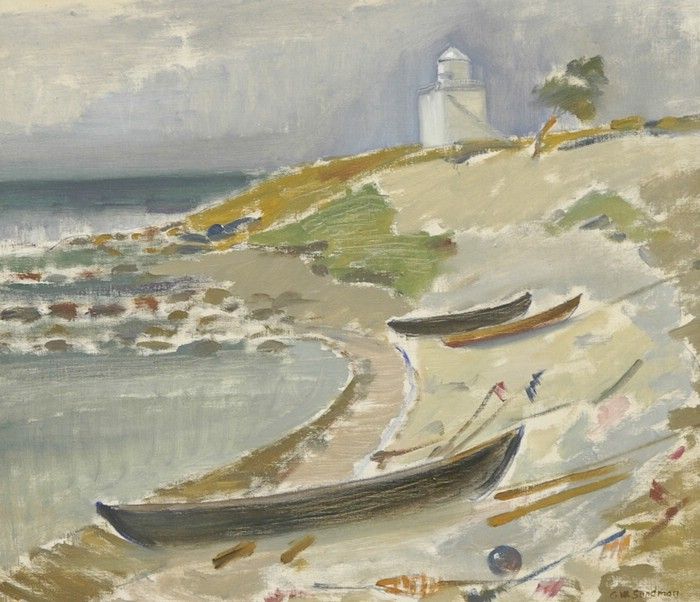 strandparti med båtar och fyr