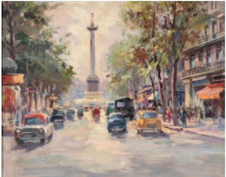 Busy Paris street scene with view to Place de la Bastille