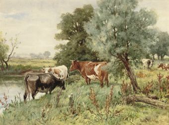 Cows grazing by a river bank