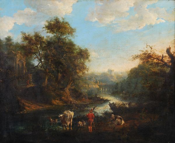 Cattle and cowherd in an extensive river landscape