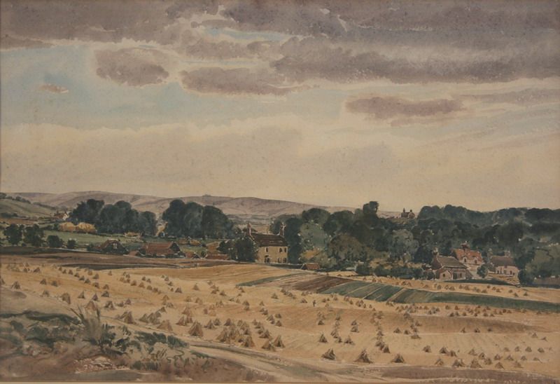 View towards Sutton, Sussex, with Corn Stooks, a Farmstead and the Downs beyond
