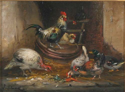 Blick auf einen Geflügelhof mit reichlich Federvieh