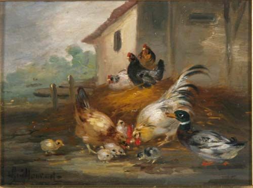 Blick auf einen Hühnerhof, im Vordergrund Ente