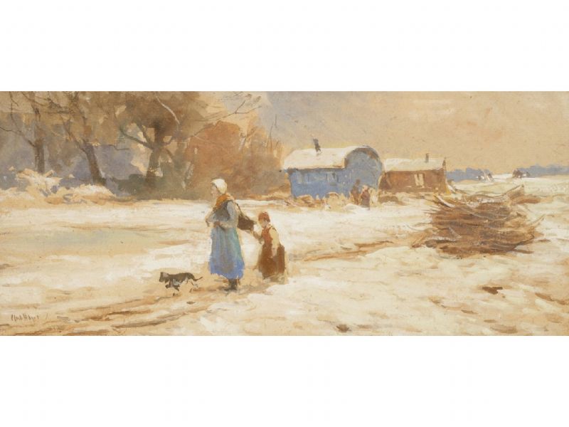 Gypsy figures in the snow with caravans beyond