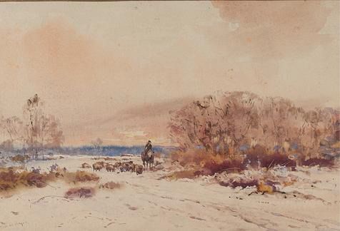 Verschneite Landschaft mit Schafherde und Hirte zu Pferd