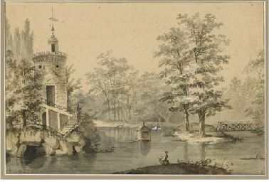 | Les jardins de Bagatelle avec une tour et un artiste assis au premier plan | |