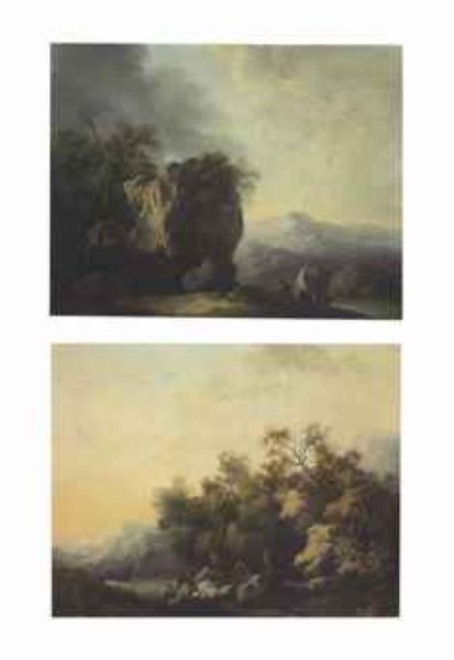 | A rocky landscape with fishermen pulling a boat ashore; and A rocky landscape with figures standing beside a stream | |