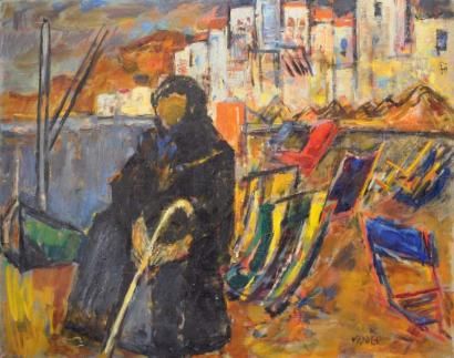 Femme à la canne sur le port