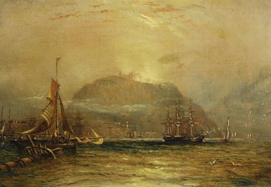 | Shipping off a harbour, a clifftop castle emerging through the mist | |
