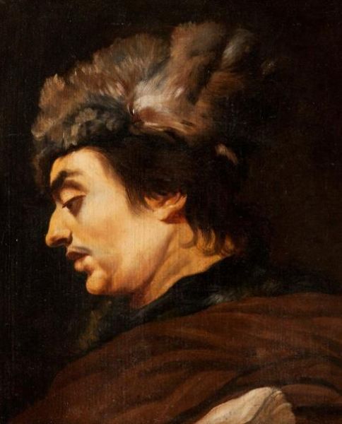 Portrait d'homme, profil gauche coiffé d'une toque en fourrure.