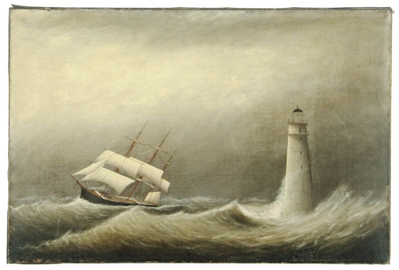 | Oil on canvas scene shows a three-mast ship in heavy seas passing Minots Light which has huge waves crashing into it | |