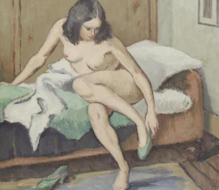 Seated female nude with green shoes