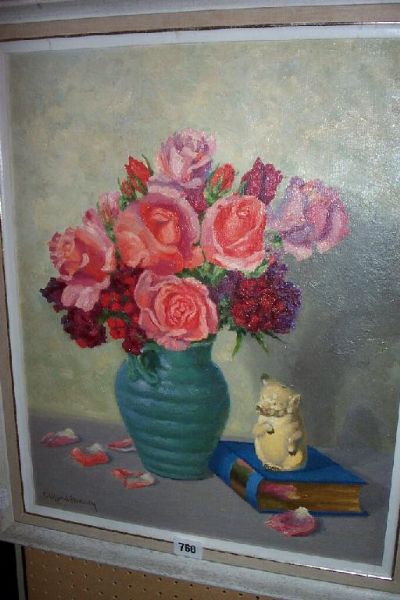 still life with vase of pink roses