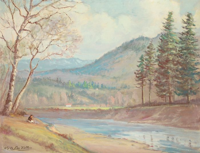 | Morning on the Clackamas, a landscape with a seated figure overlooking the river | |