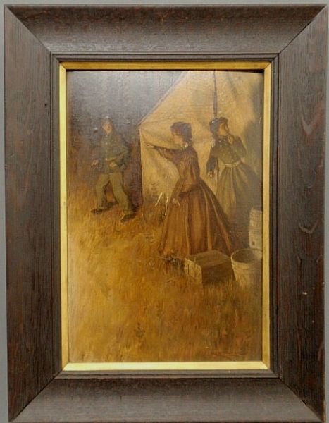 | a Civil War encampment at night with two women, one in Union uniform, and a Union soldier | |