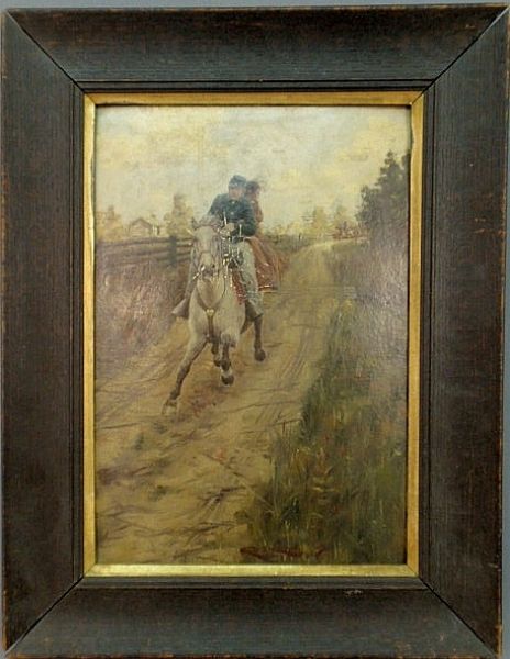 | illustrator art painting of a Union soldier and a woman on horseback fleeing from the Confederate cavalry | |